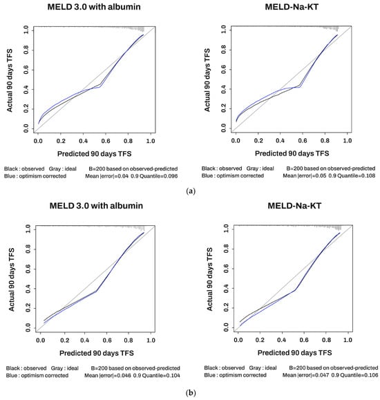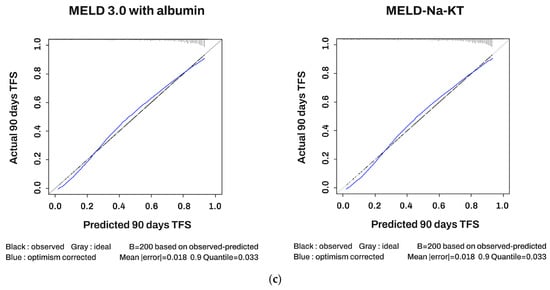 To examine the variation in discrimination ability over time, the MELD-based scores were compared using the time-dependent iAUC (Figure 1a). At all time points examined, the MELD 3.0 with albumin showed a higher iAUC value in predicting 3-month survival, TFS, and overall TFS compared to MELD-Na-KT. Regarding the prediction of overall survival, MELD-Na-KT demonstrated a higher iAUC value. Figure 2 shows a calibration plot for 3-month TFS. For both scoring systems based on the MELD, the predicted and actual probability values showed close correspondence.