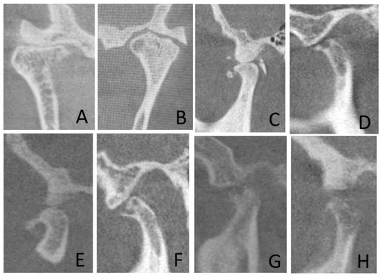 - Alexiou, K.; Stamatakis, H.; Tsiklakis, K. Evaluation of the severity of temporomandibular joint osteoarthritic changes related to age using cone beam computed tomography. Dentomaxillofac. Radiol. 2009, 38, 141–147. [Google Scholar] [CrossRef]