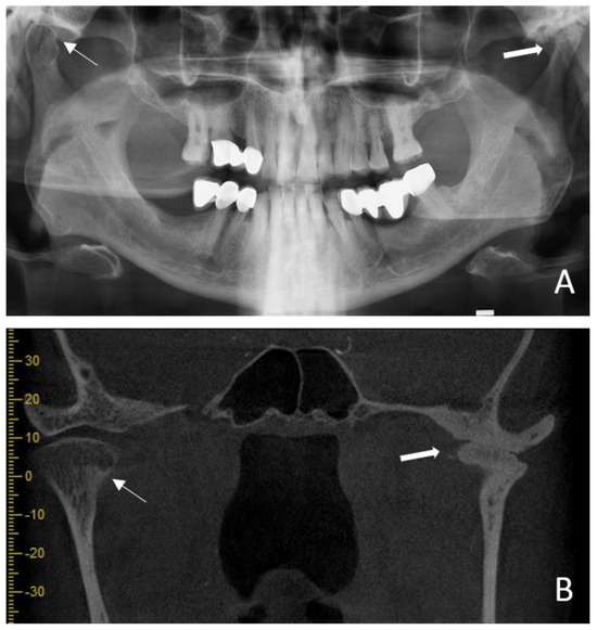 - Bessa-Nogueira, R.V.; do Egito Vasconcelos, B.C.; Duarte, A.P.; Góes, P.S.; Bezerra, T.P. Targeted assessment of the temporomandibular joint in patients with rheumatoid arthritis. J. Oral Maxillofac. Surg. 2008, 66, 1804–1811. [Google Scholar] [CrossRef]