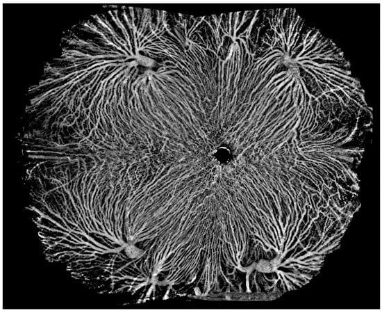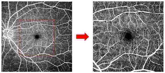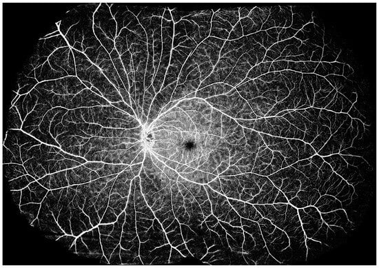 OCTA is one of the considerable advances in the OCT field []. The main principle of OCTA is the detection of the signal reflection of erythrocyte movement in the vessels. The reflected signal changes as the erythrocytes move, whereas the signal does not change for static tissues. Through scanning the same position at different moments, calculating the differences in the OCT signals, and suppressing the static tissue to the shot-noise limit, the blood vessels are imaged. The segmentation algorithm is indispensable to the overall OCTA algorithm. As the human retina has diverse vascular networks at different layers, each layer needs to be thoroughly examined for an accurate diagnosis. Previously, the segmentation algorithm commonly used was the “graph cut” algorithm. That algorithm is suitable for the segmentation of healthy retinas with continuous and relatively flat layers. However, in pathological cases, layers may be rough, uneven, thinned or thickened, and even fractured. In such cases, the graph cut algorithm may not be able to distinguish between the various layers. SS-OCT is based on a deep learning algorithm and an artificial intelligence (AI) autonomic machine learning model. In terms of computational speed, with the support of high-end graphics processors, it is no less efficient than traditional algorithms. Figure 6 and Figure 7 are two examples of such images. SS-OCTA also provides quantitative metrics, such as the foveal avascular zone, vascular density (VD), and choroidal vascularity index. Accurate quantization is based on accurate segmentation algorithms.