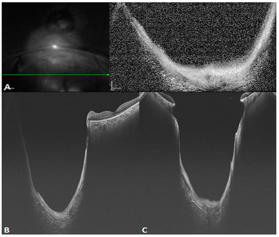 B-scan images of a patient with refractive medium turbidity and a huge choroidal coloboma. (A) Spectral-domain OCT (SD-OCT) image showing a part of the coloboma, but the structure is blurry (The green arrow in the left image indicated the orientation of B scan OCT in the right image). (B) An oblique SS-OCT scan of the same choroidal coloboma and the macular area. Even the posterior scleral space can be visualized. (C) A B-scan SS-OCT image with a range of 20 × 20 mm showing the full extent of the choroidal coloboma.