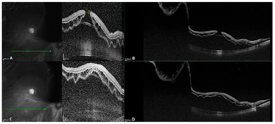 B-scan images of a patient with slightly refractive medium turbidity and a macular hole. (A,C) SD-OCT images revealing a macular hole and a part of the detached retina; the choroid is not visible because the retina detachment is too high. (B,D) SS-OCT images with a depth of 6 mm and width of 24 mm, clearly visualizing the retinal detachment, as well as the choroid and part of the sclera.