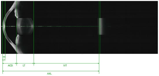 Full-eye, super-depth SS-OCT, achieving an imaging depth up to 40 mm and a 16 mm field of view. CT, cornea thickness; ACD, anterior chamber depth; LT, lens thickness; AXL, axial length; VIT, vitreous.