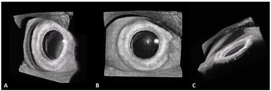 The acquisition efficiency of SS-OCT is tremendously improved over that of SD-OCT. That ultrafast speed, together with efficient horizontal and longitudinal scanning, enables the creation of 3D images, as displayed in Figure 9. It allows for a more intuitive and stereoscopic view of the positional relationships between the structures of the anterior segment. The 3D imaging of the anterior segment may greatly improve ophthalmic imaging diagnosis for conditions such as intraocular lens implantation (Figure 10) and anterior chamber space-occupying lesions. Anterior 3D-OCT is helpful in enabling precise customization in refractive surgeries, cataract intraocular lens implantation, and assessing the anterior angle and aqueous outflow for glaucoma diagnosis and monitoring [].