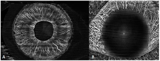 SS-OCTA of the anterior segment. (A) Iris angiography; (B) conjunctival angiography.