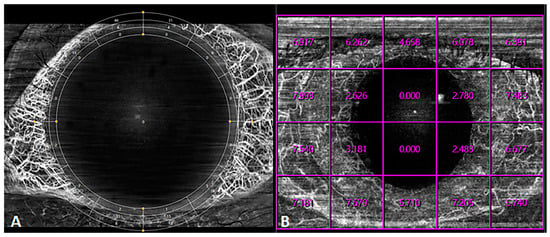Quantification of anterior-segment OCTA blood flow. (A) EDTRS grid mode for the determination of the vascular density. (B) Grid mode for the determination of the vascular density. In each lattice, the vascular density is displayed in the corresponding region.
