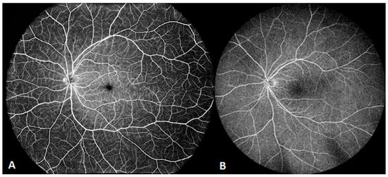 Ultra-wide images of two healthy eyes. (A) An ultra-widefield OCTA image of 29 × 24 mm (inner angle = 150°) for a healthy retina with a single scan. (B) An ultra-widefield fluorescence angiographic image with an inner angle of 102°.