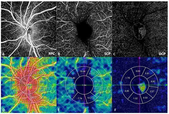 Optic-nerve-head OCTA is widely used in the assessment of diseases that cause changes in the optic disc, such as glaucoma, anterior ischemic optic neuropathies, and papilledema. Stratification of the optic disc blood flow via SS-OCTA maintains the traditional OCTA division, including the superficial capillary plexus, deep capillary plexus, and radial peripapillary plexus (Figure 16). It can also be used to quantify the perfusion and VD of circumpapillary regions or the entire optic nerve head. However, the current role of optic-nerve-head OCTA seems to be more supportive and used for follow-up rather than diagnosis [].