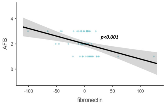 Scatter plot of age- and gender-adjusted fibronectin (pg/dL) levels with AFB.