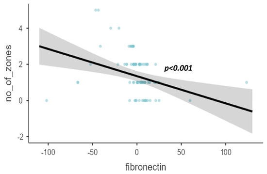 When adjusted to age and gender, fibronectin showed a reducing trend on the scatter plot as the mycobacterial bacterial load in sputum smear examination increased with a significant value (p < 0.001), as shown in Figure 1. Similarly, the age- and gender-adjusted fibronectin levels reduced as the number of zones affected by the chest X-ray increased (p = 0.001), as shown in Figure 2.