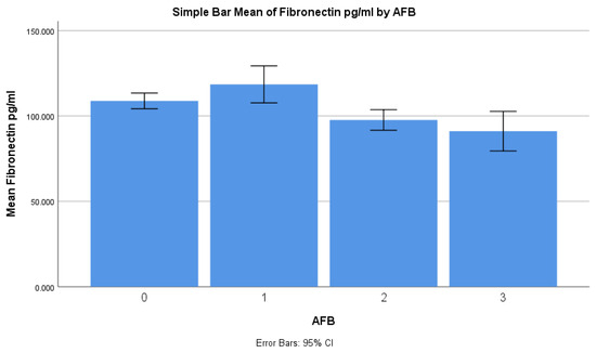The demographic parameters examined included age, sex, weight, smoking status, fibronectin levels, total protein levels, albumin levels, red blood cell count, and hemoglobin levels (Table 1). The results showed that there was no significant difference in age between the control subjects and tuberculosis patients (p = 0.1681). In terms of sex distribution, both groups had a similar proportion of males and females (p = 0.5342). However, a significant difference was observed in weight, with the control subjects having a higher mean weight (72.5 kg ± 0.8) compared with the tuberculosis patients (55.6 kg ± 10.9). Smoking status did lead the groups to differ significantly (p = 0.7082), with approximately 58.4% of the participants overall being non-smokers. The fibronectin levels were lower in the PTB patients (102.4 ± 26.7) when compared with the normal group (108.8 ± 6.8). However, it did not achieve statistical significance. Analysis of the fibronectin levels was conducted within subgroups (overall study population, controls, and cases), considering various factors such as age (Table S1), smoking status (Table S2), diabetes (Table S3), AFB score (Table S4), and the number of chest X-ray zones (Table S5) contributing to disease severity.