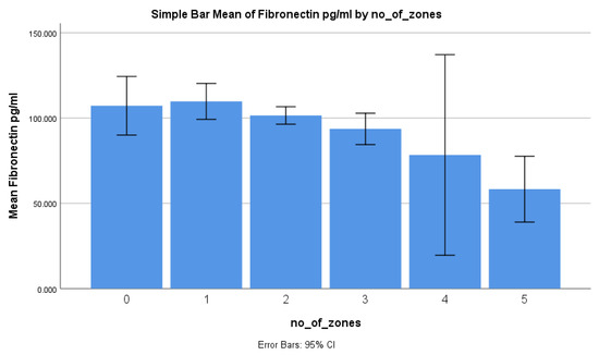Bar graph depicting mean fibronectin levels against the involvement of a number of zones in a chest X-ray (p = 0.0261).