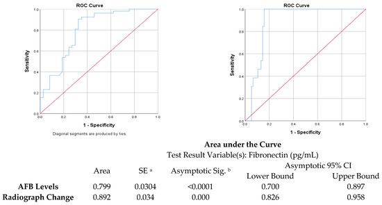The statistical analysis was performed using jamovi (v2.2.5., The jamovi Project, SYD, AUS). Descriptive and inferential statistical methods were employed to compare between the normal and TB patients. The normality of the data was assessed using the Shapiro–Wilk test. Continuous variables were presented as the mean ± SD (min-max), and the categorical variables were presented as numbers (%). Analysis of variance (ANOVA) was used to compare the mean values among different groups, while the Student’s t test and chi-squared test were utilized to determine the significance of study parameters between two groups. A p value of less than 0.05 was considered statistically significant. Linear regression was employed to assess the association between the fibronectin levels and TB severity based on the sputum smear and chest X-ray findings. Receiver operating characteristic (ROC) analysis was performed using the calculated values (determined by Youden’s index) for the area under the curve (AUC), sensitivity, specificity, and odds ratio, and the optimal cut-off values of fibronectin for differentiating between an AFB less than two and more than two, as well as the number of zones involved in the chest X-ray (less than three and more than three), were calculated.