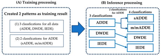 Second, inference processing was carried out by inputting the test data into the newly created trained model. It was first classified into the ADDE, DWDE, or IEDE subtypes described in (1) above, and then classified further into either sADDE or m/mADDE, as described in (2) above, to differentiate between sADDE and m/mADDE when the data are classified as ADDE. Based on the above results, the probability of 4 classifications was calculated from the classification probabilities of 3 classifications and 2 classifications.