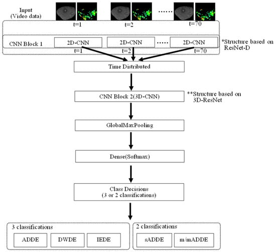 A subtype classification of DE was conducted in a standard way in training and inference processing, as shown in Figure 2, using the video data created by the above-mentioned method. First, the training processing was performed using the training data, and the trained models of 3 classifications and 2 classifications were prepared as follows:
