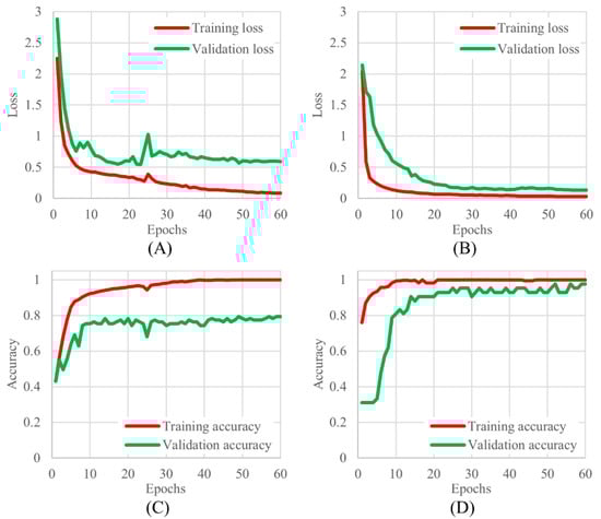 The learning curves for 3 and 2 classifications, (A) 3 classifications of training and validation loss, (B) 2 classifications of training and validation loss, (C) 3 classifications of training and validation accuracy, and (D) 2 classifications of training and validation accuracy.