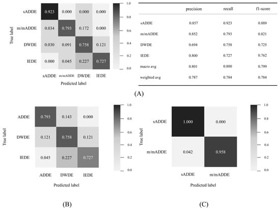 For each subtype, sADDE was less prone to being misinterpreted than the other subtypes, with recall exceeding 0.9 and a precision of 0.857, which were both higher than those in the other subtypes. m/mADDE, DWDE, and IEDE were prone to misinterpret each other with lower recall and precision compared to sADDE, but the recall was above 0.7 in all cases. However, DWDE had lower precision, and it was more frequently prone to being misinterpreted as other types, such as m/mADDE and IEDE. m/mADDE and IEDE had precision equal to or greater than 0.8 and were less prone to being misinterpreted. m/mADDEs and IEDEs had a precision of 0.8 or higher and were less misinterpreted as other types than DWDEs. m/mADDE, DWDE, and IEDE had lower BVs, and they were prone to misinterpret each other due to the presence of hard-to-distinguish data.