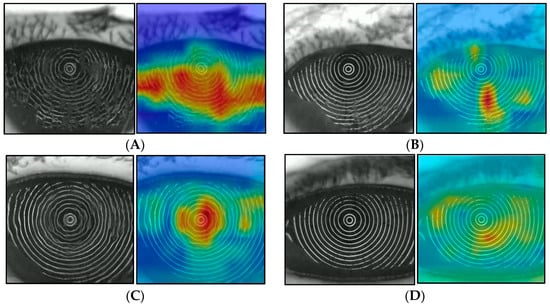 Heat map with Grad-CAM++ (left: original image; right: heat map), (A) example of sADDE (5.0 s after opening eye), (B) example of m/mADDE (5.0 s after opening eye), (C) example of DWDE (immediately after opening eye), and (D) example of IEDE (5.0 s after opening eye).