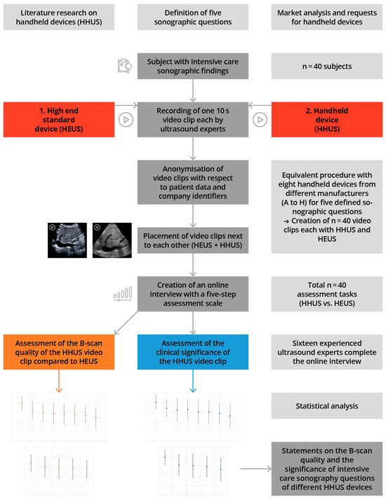 The first step was to record findings obtained under the previously defined sonographic question in randomly selected intensive care patients, using a traditional HEUS system with stand-alone devices (Canon Aplio i900, Canon Medical Systems Corporation, Ōtawara, Japan); these findings were defined as the highest benchmark. Immediately afterwards, the same findings were recorded with one of the HHUS devices to be tested. Both examinations were performed by the same examiner, and the documentation was undertaken with both the HHUS devices and the HEUS system as a 10s long video clip. Thus, a total of 40 video clips were created, using 5 different sonographic sections and 8 different HHUS, with the participation of 40 test subjects.