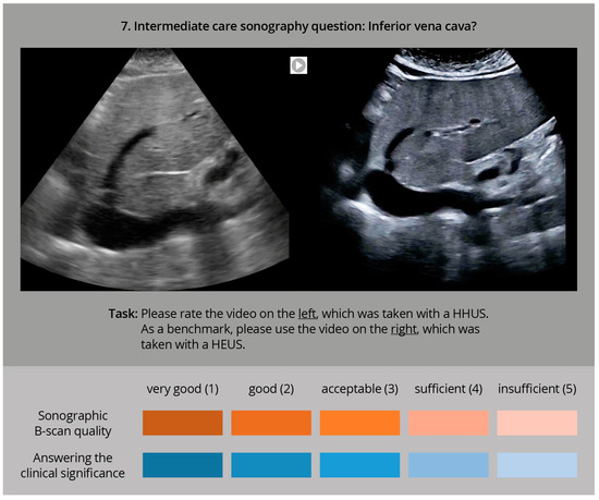 Sample question of the online interview with two sonography videos to be played in parallel (HHUS and HEUS), to be evaluated by the participating ultrasound experts using two rating scales with regard to sonographic image quality and clinical significance, in accordance with [27,28].