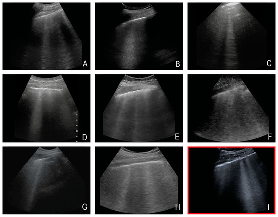 Exemplary representation of the sonographic question “B-lines” by eight different HHUS devices (in the first row, devices (A–C), in the second row, devices (D–F), and in the third-row, devices (G,H)), and the HEUS device (Canon Aplio 900i) used as reference ((I)—marked in red). Note: All images are from different subjects. This figure is intended to illustrate an approximate impression of the different representation of B-lines by the various HHUS devices.