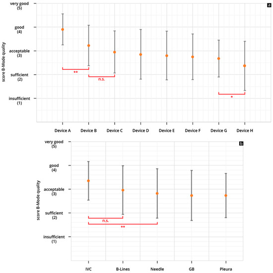 (a,b) Mean point score and SD achieved in the assessment of the B-scan quality of the individual HHUS devices (a) and mean cumulative scores for all HHUS devices and SD as a function of the sonographic sections (b) (* p < 0.05; ** p < 0.01; n.s., not significant; Analysis of Variance (ANOVA analysis). The order in which the individual HHUS devices were displayed was determined by the score achieved. The device with the highest point score in the evaluation of B-scan quality is referred to as Device A; the following devices are accordingly designated Device B, C, etc., and the device with the worst rating, Device H. A complete list of the p values can be found in the Supplementary Tables S2 and S3.