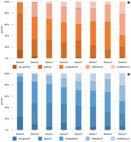 For the highest scored device (device A), the clinical significance was rated “acceptable” or better in 97.5% of the submitted reviews; more than 83% of the given reviews were “good” or “very good”. This was the only device that did not receive an “insufficient” rating (Figure 5b).