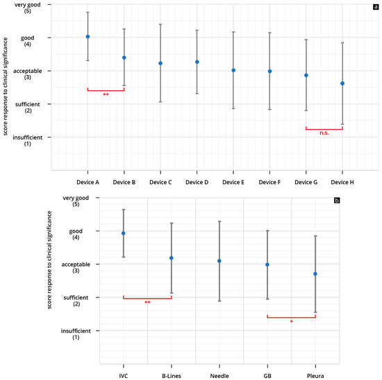 The HHUS devices were rated between 2.61 ± 1.23 (device H) and 4.03 ± 0.73 (device A), in regard to clinical significance. Here, too, device A was rated the highest among all tested devices, and the difference between this device and the others (devices B–H) also reached a significant level (refer to Figure 6a).