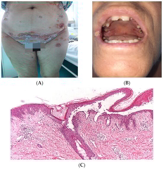 A 58-year-old woman diagnosed with pemphigus vulgaris; (A,B)—clinical aspect; (C)—suprabasal acantholysis histopathological aspect (HE ×5).