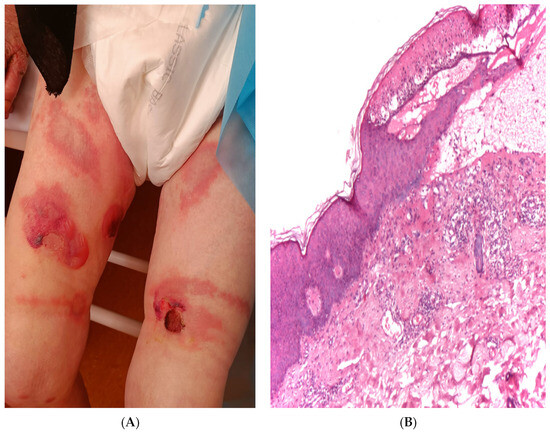 An 83-year-old woman diagnosed with bullous pemphigoid; (A)—clinical aspect; (B)—subbasal acantholysis, histopathological aspect (HE ×10).