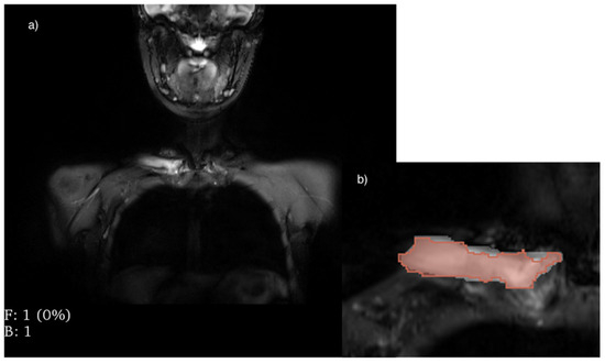 CNO hyperintensity sampling: (a) shows a hyperintense signal in the right clavicle, (b) shows the corresponding ROI drawn manually using the 3D Slicer program on the corresponding hyperintensity.