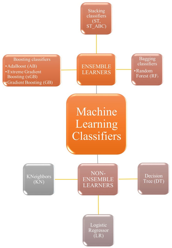 Machine Learning classifiers tested in the present study. Non-ensemble learners included KNeighbors, Logistic Regressor and Decision Tree. Ensemble learners included boosting, Stacking and bagging classifiers.