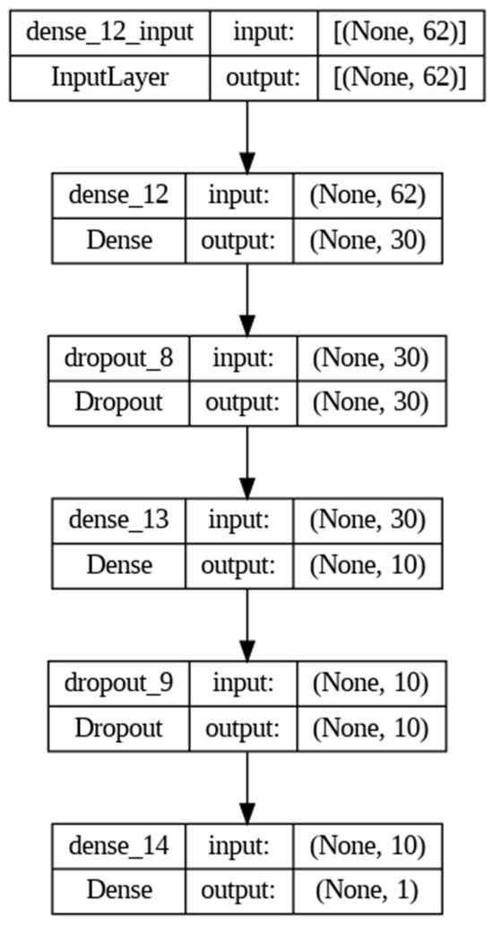 Neural Network structure: input layer with 62 units, first hidden layer with 30 units and L2 regularization, first dropout layer, second hidden layer with 10 units and L2 regularization, second dropout layer, output layer with 1 unit and sigmoid activation.