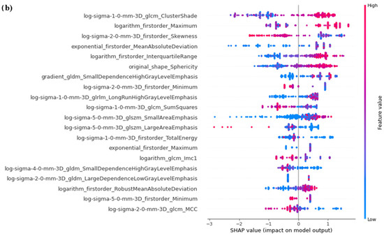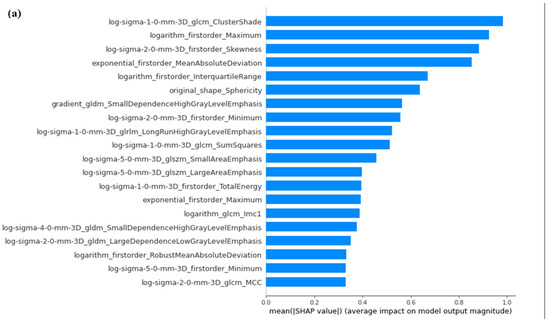 The gold standard for initial evaluation and disease follow-up in CNO is the Whole-Body MRI (WBMRI), which allows detection of the presence of hyperintense edema-like lesions on the short tau inversion recovery (STIR) sequences. Their morphology is variable; therefore, it is possible to detect signal alterations ranging from poorly defined ones to confluent ones [17]. Some authors refer to them as “field in flames” [18] (Figure 1a). However, the high signal on STIR sequences is not specific because it may simply represent increased water content [19,20] compared with the surrounding bone; for this reason, it is not specific for CNO, and it can also be detected in other pathologic conditions (such as infectious osteomyelitis, leukemia, Langerhans cell histiocytosis, scurvy, etc.) or in a physiological contest, such as in the presence of hematopoietic bone marrow, well represented in the bones of pediatric patients [21]. Red marrow is made up of 40% water, 40% fat and 20% protein. Therefore, it appears hyperintense on T2-weighted (T2w) and fluid-sensitive sequences [22,23] (Figure 1b). Extracting clinically relevant information from radiological imaging is proving to be a powerful tool in the implementation of artificial intelligence algorithms [24]. Indeed, radiomics is commonly used to predict patient outcome through automated high-throughput feature extraction, and, particularly, the main purpose is to elucidate the subtle relationships between the characteristics of the image and the disease status. Recent studies have shown a performance level almost comparable to that of practicing radiologists [25,26,27]. In the literature, there are examples of automatic segmentation of the hyperintense signal of CNO and bone marrow [28], but it still lacks studies that focus on the differentiation between the two types of signal through ML. In addition, we adopt the unified framework Shapley additive explanations (SHAP), a technique commonly used to interpret models, rank the feature importance, identify which features contribute negatively or positively to the prediction performance and also further select the optimal feature sets [29].