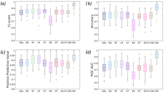 Boxplot comparison between the nine ML classifiers used in terms of (a) F1-score, (b) Accuracy, (c) Positive Predictive Value, (d) ROC/AUC.
