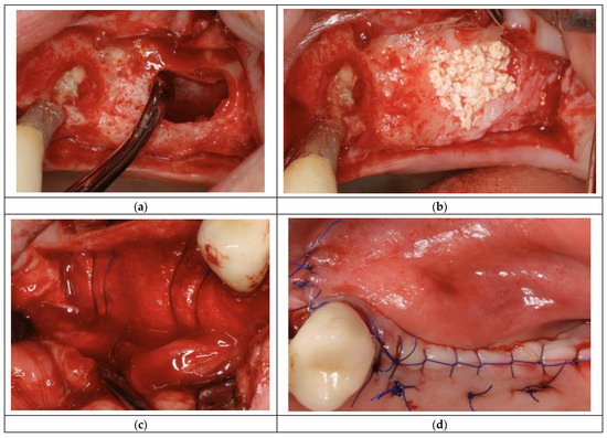Maxillary sinus floor elevation (patient #3): lateral bony window with the ‘trap-door’ technique (a), sinus filled with inorganic bovine bone mineral (b), lateral window covered by resorbable collagen membrane (c), wound closure (d).