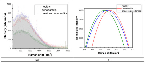 Luminescence corresponding to selected patients according to medical status (healthy, previous periodontitis and periodontitis). (a) Raw data for Raman spectra; (b) Normalized values of Col for Raman shift related to reference value 550 cm−1.