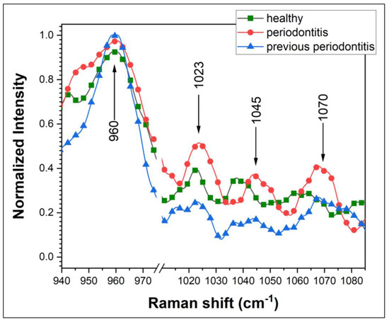 Raman spectra, representative for the patient’s medical status (healthy, previous periodontitis and periodontitis).