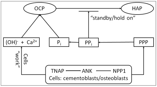 For the transition OCP → HAP, we presume intrusion of Ca2+ and (OH)1− to the OCP elementary cell network (by chelation and disruption of the water layer bound on the crystal surface) that is achieved with the mechanical action (W, Work) of cementoblast/osteoblast cells supported by proteins (PV—Phosvitin, PPP—Phosvitin phosphopeptides) and enzymatic activity of TNAP, ANK and NPP1 during homeostasis in the extracellular space [25,26,27,28,29,30].