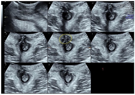 Three-dimensional transperineal ultrasound performed one month after secondary surgery. The anal sphincter repair is indicated by the yellow circle.