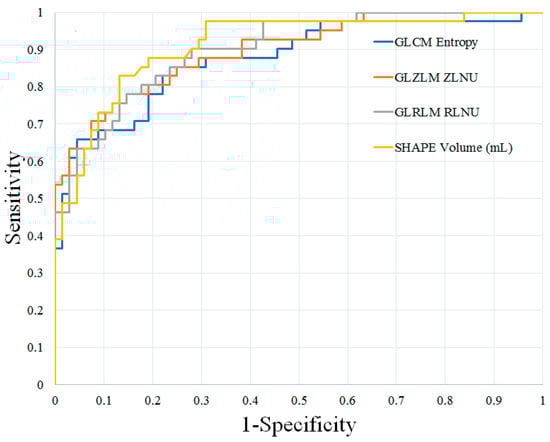 ROC curves of the best individual texture features for distinguishing benign and malignant cervical lymph nodes in patients with HNSCC. HNSCC, head and neck squamous cell carcinoma; GLCM, Gray-Level Co-Occurrence Matrix; GLZLM, Gray-Level Zone-Length Matrix; GLRLM, Gray-Level Run-Length Matrix; ZLNU, zone-length non-uniformity; RLNU, run-length non-uniformity.