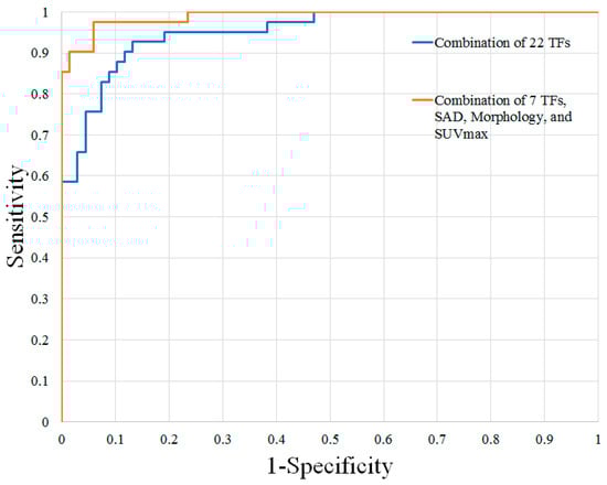 ROC curves of the top combinations for distinguishing benign and malignant cervical lymph nodes in patients with HNSCC. HNSCC, head and neck squamous cell carcinoma; TFs, texture features; SAD, short-axis diameter; SUVmax, maximum standardized uptake value.