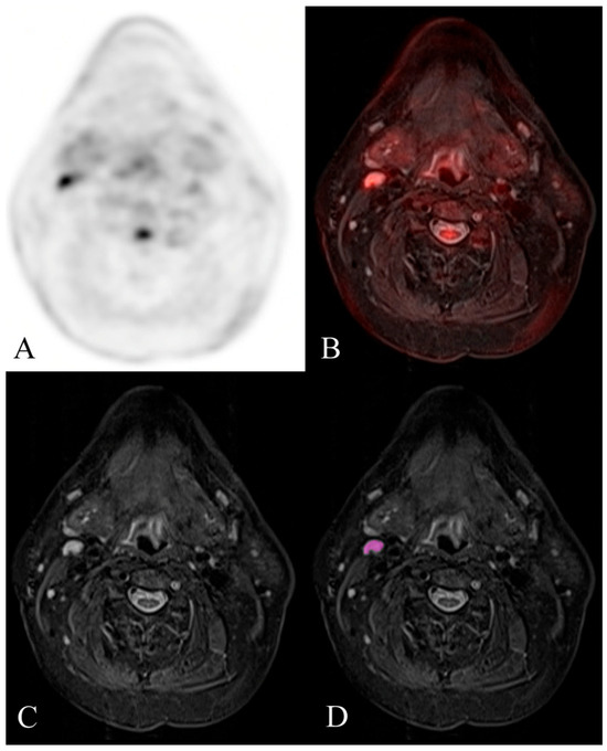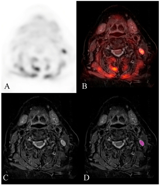 Example of a histologically confirmed malignant cervical lymph node. FDG-PET/MR evaluation of a patient with HNSCC. (A) attenuation-corrected FDG-PET, (B) fused axial STIR, (C) axial STIR, and (D) segmented axial STIR images. There is a left level 2B FDG-avid lymph node (SUVmax 9) that measured 7 mm in short-axis diameter and demonstrated abnormal morphology. Texture analysis was performed within the visualized region of interest in image (D). This node was histologically confirmed as malignant after neck dissection. Mild hypermetabolic activity is also visualized in the musculature of the neck, likely related to muscle strain.
