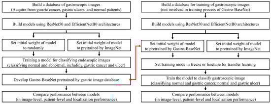 For transfer learning, the fully connected (FC) layer responsible for the classifier of the existing trained CNN model is removed, and new FC layers are connected to adjust the weights through training for our purpose [15]. Gastro-BaseNet was used a pre-trained model from the ImageNet database to classify normal or abnormal (including gastric cancer and ulcers) in gastroscopic images to transfer learning. To develop a predictive model for gastric cancer or ulcer, we used two pre-trained models (ImageNet, which is generally used, and Gastro-BaseNet, which is trained by a gastroscopic database) and compared their performance (Figure 2).