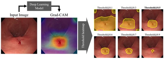 The evaluation process for calculating localization performance based on Grad-CAM; yellow line: the location of the lesion predicted by the model, the bolded threshold: the value used for localization in this study.