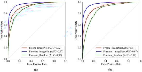 Comparison of ROC curves for normal and abnormal classification models: (a) comparison of model performance by training method based on ResNet50 architecture. (b) comparison of model performance by training method based on EfficientNetB0 architecture.