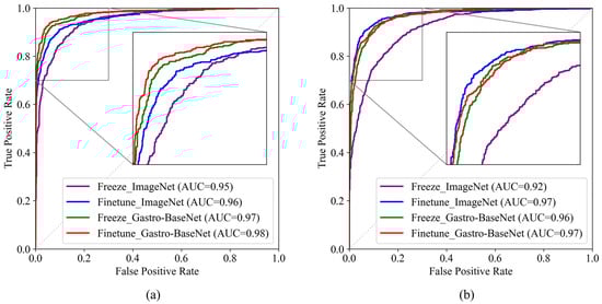In the ResNet50 architecture, the highest AUC score of 93.82% was achieved using Gastro-BaseNet in fine-tune mode, as shown in Figure 8a. According to the pairwise comparison results of the ROC curves in Table 7, there is a p-value of 0.0005 in the freeze mode and a p-value of 0.0004 in the fine-tune mode. While in the EfficientNetB0 architecture (Figure 8b), both training modes showed a p-value lower than 0.0001 in pairwise comparison results, indicating a significant difference in the training using Gastro-BaseNet.