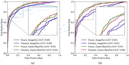 Comparison of ROC curves for normal and gastric cancer classification models using Gastro-BaseNet: (a) comparison of model performance by training method based on ResNet50 architecture; (b) comparison of model performance by training method based on EfficientNetB0 architecture.