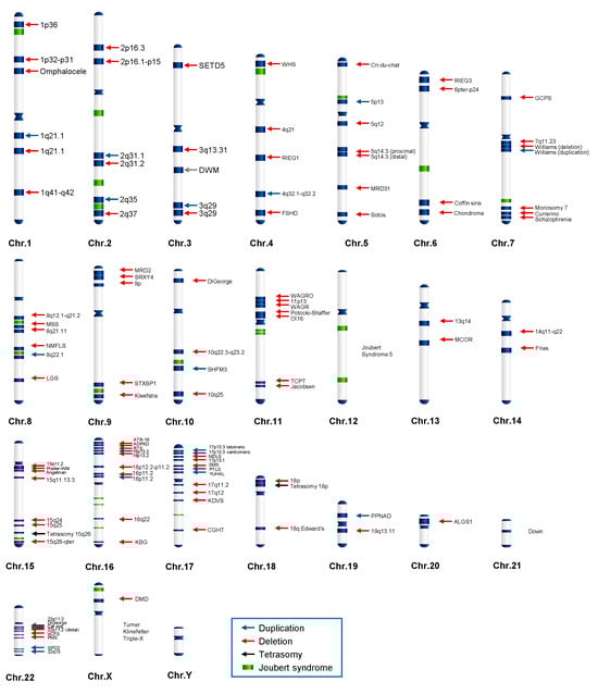 Schematic overview of 138 CNV-related chromosomal disorders. Red, blue, and black arrows indicate microdeletions, duplications, and tetrasomy, respectively. Green bars indicate Joubert syndrome types.