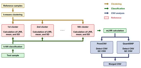 Key steps involved in Copy Number Variation (CNV) analysis using machine learning techniques. Reference samples indicate the clinical samples for clustering genomic waves. Golden brown arrows represent the clustering process, the green color indicates the classification process of the “Test sample”, and the navy color indicates the CNV analysis process after “mLRR calculation”.